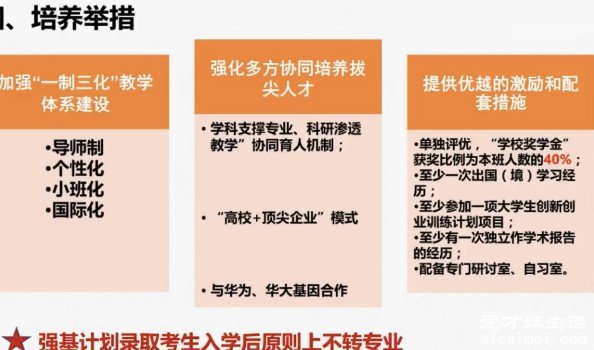 强基计划的人才培养方式,就是高校招生针对单独的人才,制定对应的培养方案,以及独特的激励机制,帮助学生更加清楚自己的人生方向,以及未来规划,来培养国家需要的科技型人才,为国家的繁荣富强增添一份力量......【查看详情】